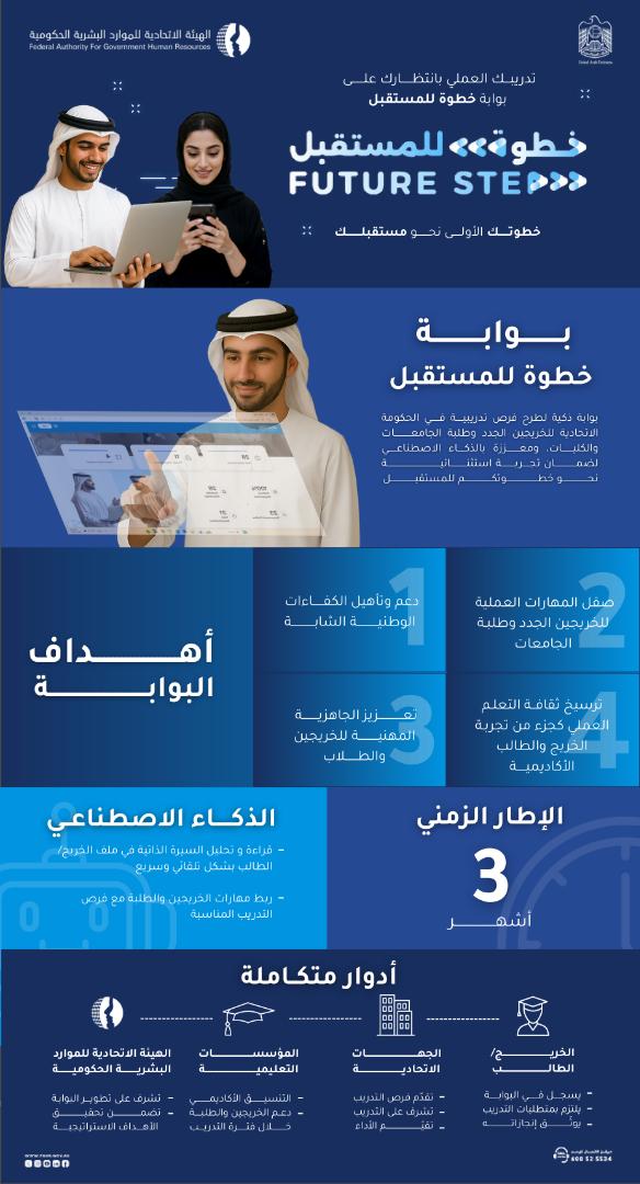تعمل بوابة "خطوة للمستقبل" -المعززة بالذكاء الاصطناعي- كحلقة وصل بين الجهات الاتحادية والخريجين وطلبة الجامعات، حيث تتيح للجهات نشر الفرص التدريبية المتوفرة لديها بشكل مباشر، وتمكّن الخريجين الجدد والطلبة من استعراض هذه الفرص والتقديم عليها، ومتابعة الطلب إلكترونياً بكل سهولة وشفافية.