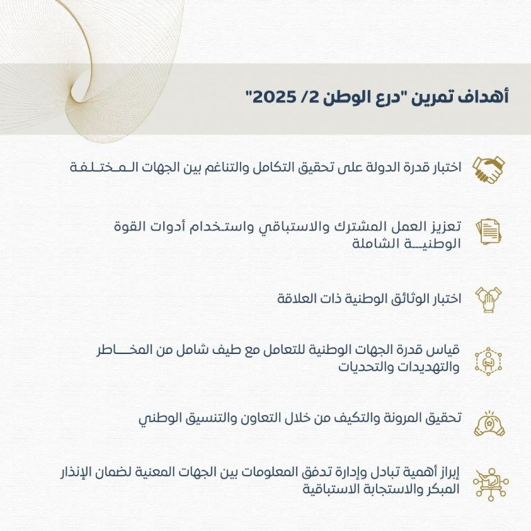 تعزيزاً لأهمية التنسيق بين الجهات المعنية، وضمن سلسلة من التمارين الاستراتيجية التي تهدف لرفع جاهزية دولة الإمارات وقدرتها.. تنفذ "الطوارئ والأزمات" تمرين "درع الوطن 2/ 2025"، بالتعاون مع جميع الجهات المعنية الاتحادية والمحلية والخاصة، والذي يستمر لمدة 11 يوماً خلال الفترة من 13 إلى 23 يناير الجاري.