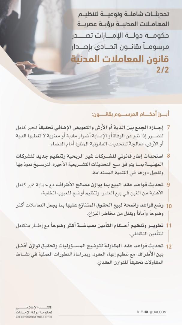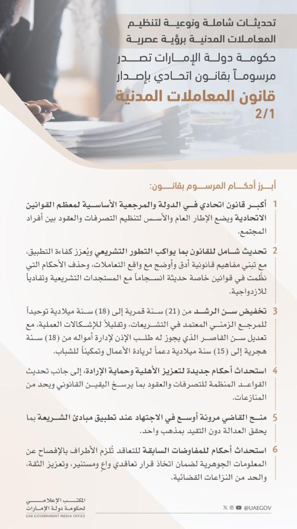 أصدرت حكومة دولة الإمارات مرسوماً بقانون اتحادياً بإصدار قانون المعاملات المدنية الجديد، بهدف ترسيخ منظومة قانونية متكاملة، حيث يعتبر القانون الجديد خطوة تشريعية محورية ويُمثل نقلة نوعية في الأحكام الناظمة للمعاملات المدنية في الدولة.