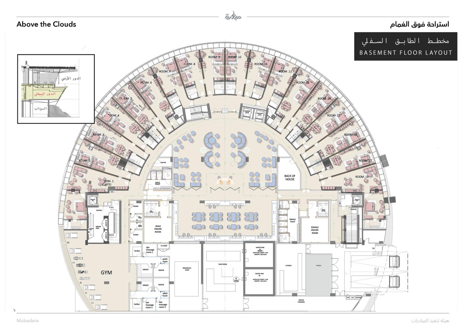 · القبو: يحتوي على قاعة متعددة الأغراض تسع لـ 150 شخصاً