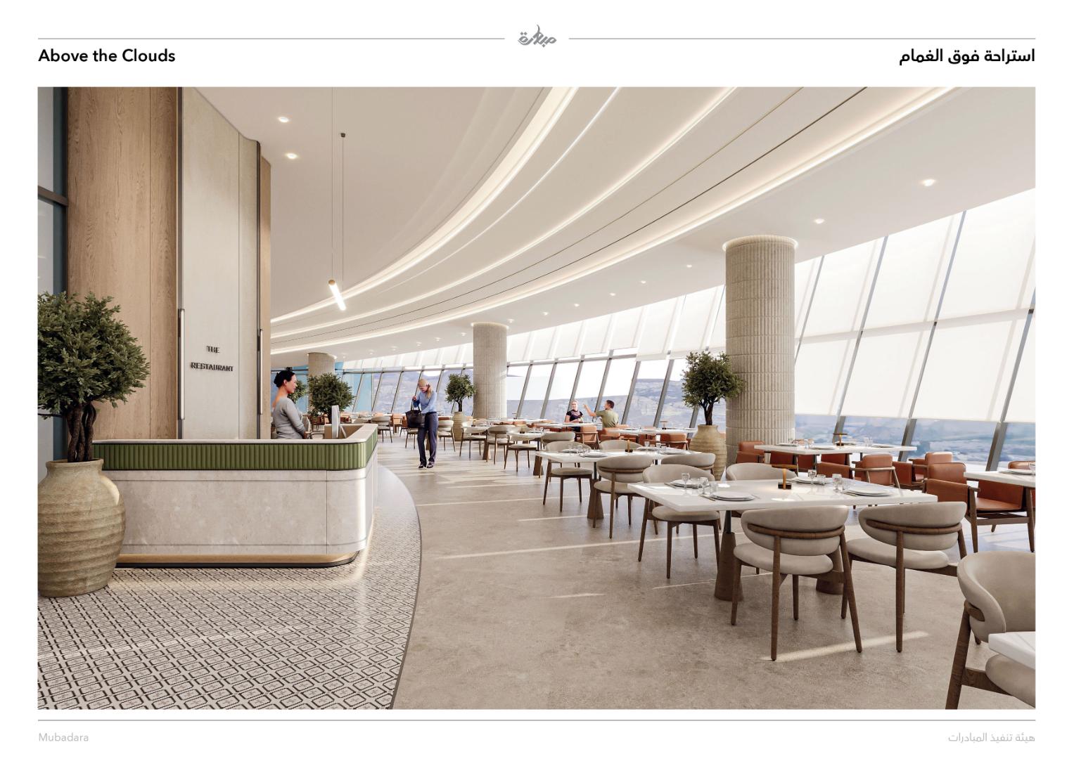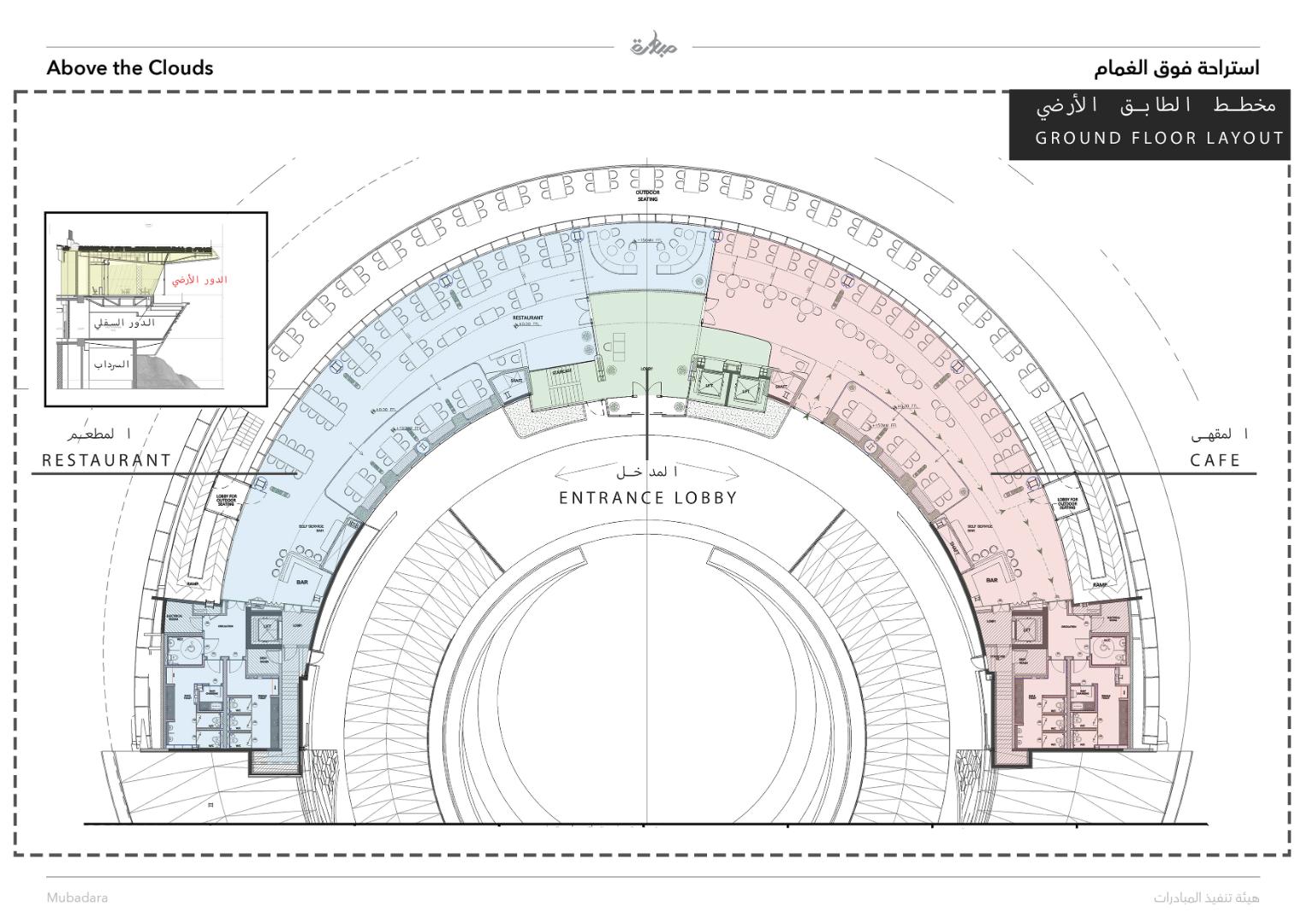 · الدور الأرضي: تبلغ مساحته 1858 متراً مربعاً يشتمل على مطعم ومقهى يسع لعدد 220 شخصاً في القاعة الداخلية و48 في الشرفة الخارجية.