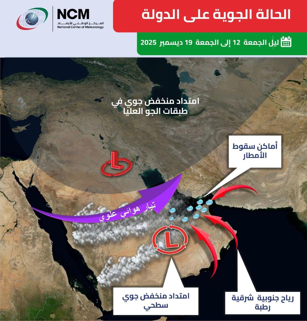تتأثر الدولة بامتداد منخفض جوي سطحي مع امتداد منخفض جوي علوي يتعمق ويضعف أحياناً ويصاحبه تشكلات مختلفة من السحب مع فرصة سقطوط أمطار متفرقة على فترات متباعدة.