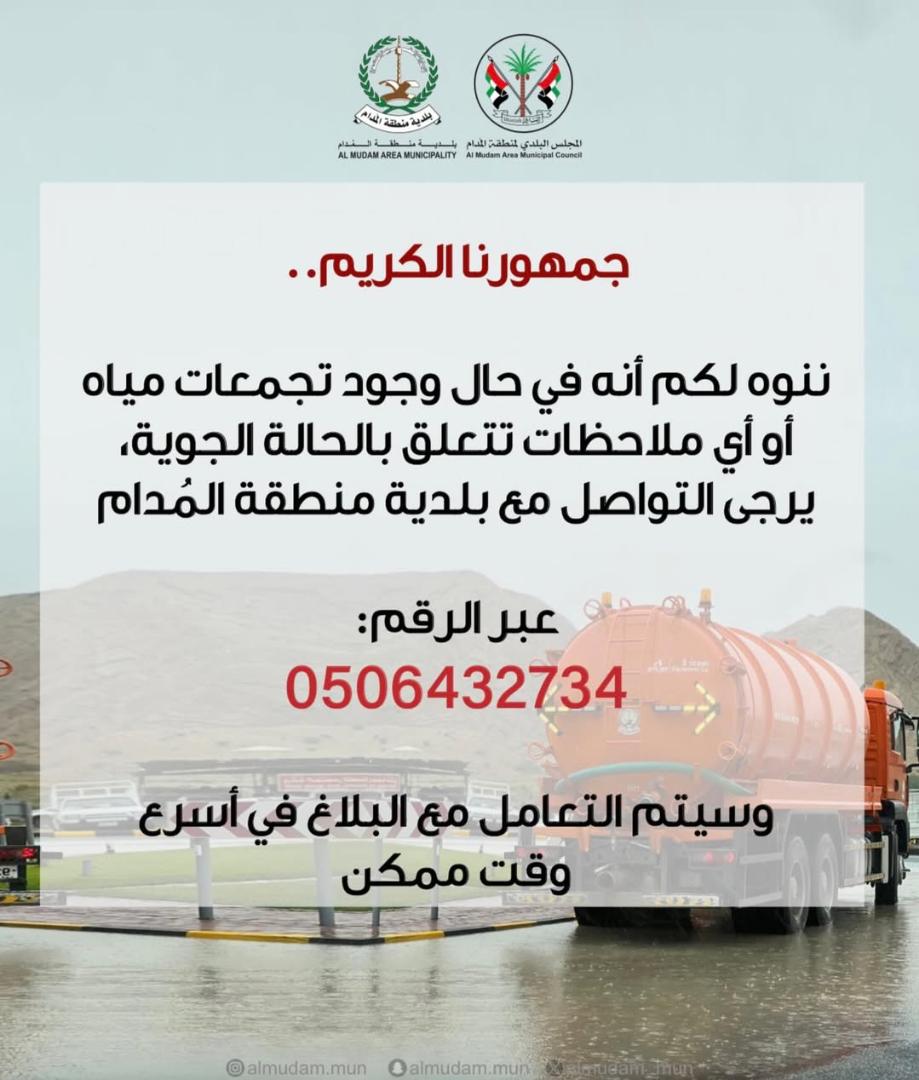 بلدية منطقة المُدام: في حالة وجود تجمعات مياه أو أي ملاحظات تتعلق بالحالة الجوية يرجى التواصل عبر الرقم: 0506432734 وسيتم التعامل مع البلاغ في أسرع وقت ممكن.