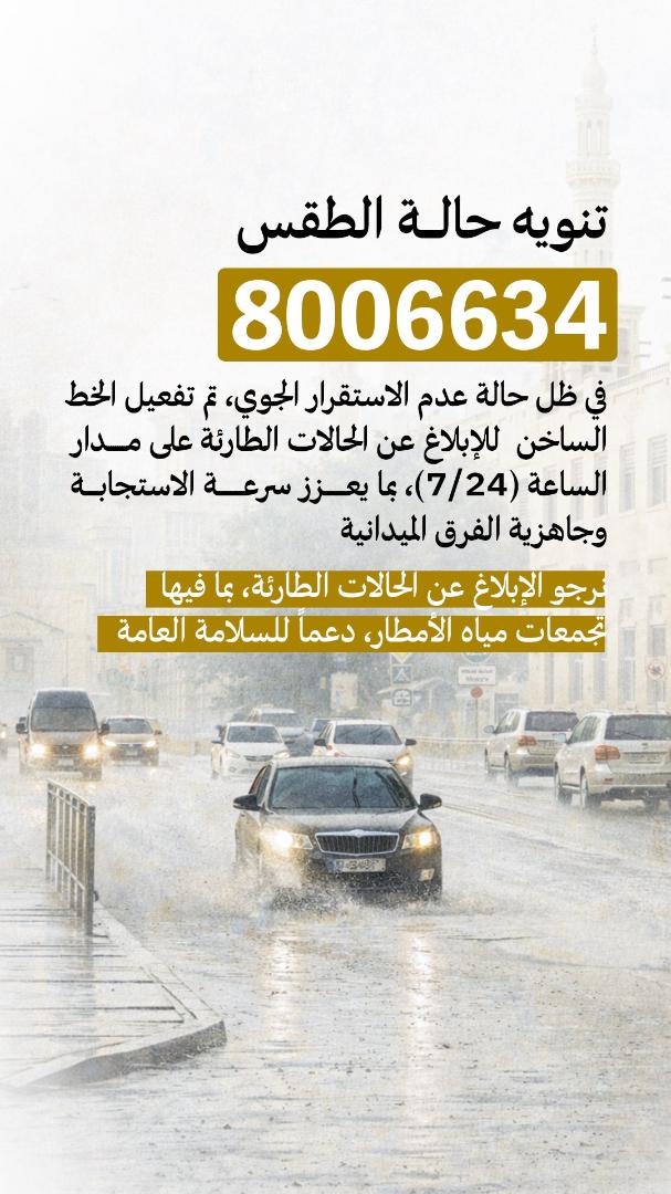 وزارة الطاقة والبنية التحتية تعلن تفعيل الخط الساخن (8006634) للإبلاغ عن الحالات الطارئة وتجمعات مياه الأمطار على مدار الساعة بما يعزز سرعة الاستجابة دعماً للسلامة العامة.