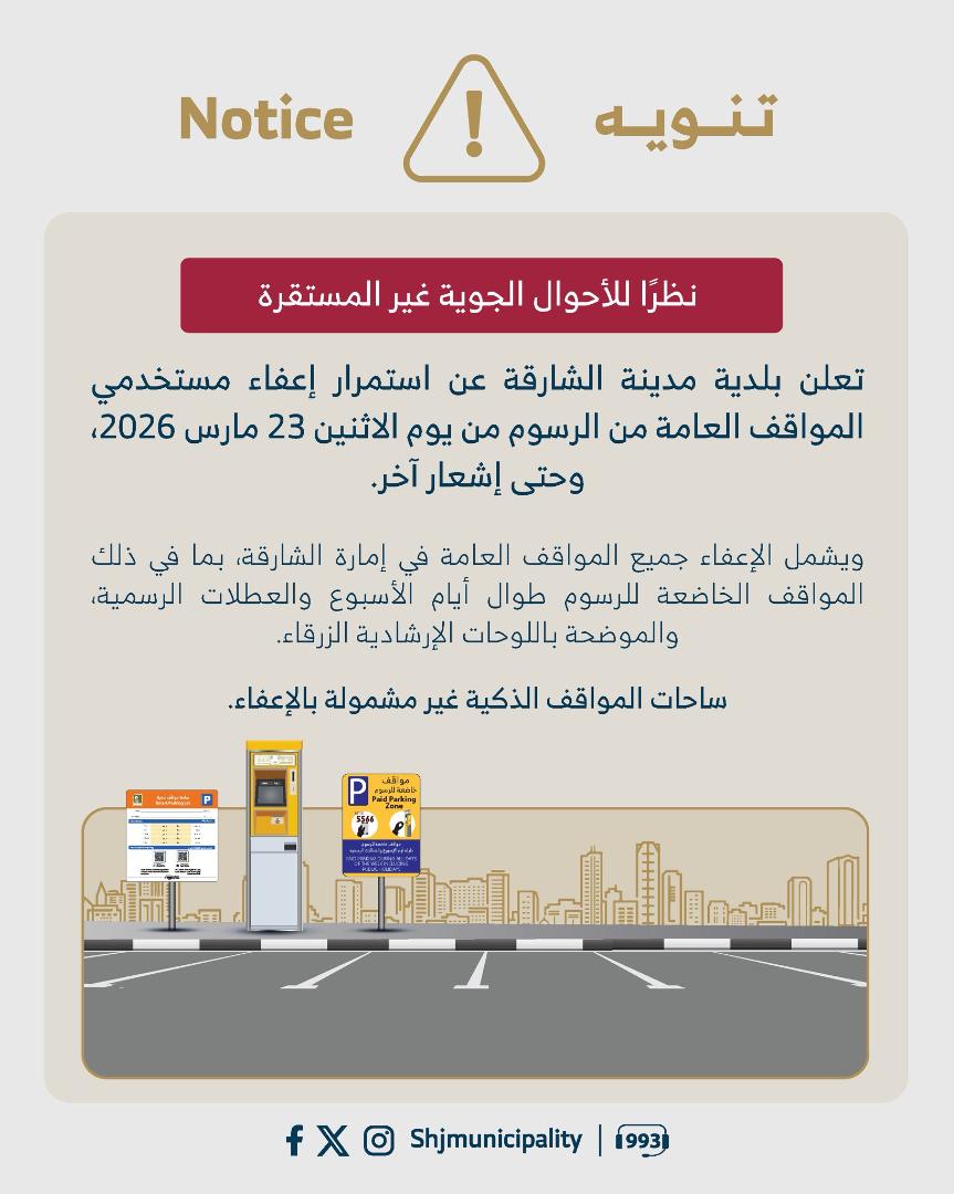 نظراً للأحوال الجوية غير المستقرة .. بلدية مدينة الشارقة تعلن استمرار إعفاء مستخدمي المواقف العامة من الرسوم، اعتباراً من أمس الاثنين 23 مارس 2026 وحتى إشعارٍ آخر، ويشمل الإعفاء جميع المواقف العامة في الإمارة، بما في ذلك المواقف الخاضعة للرسوم طوال أيام الأسبوع والعطلات الرسمية، والموضحة باللوحات الإرشادية الزرقاء، ولا يشمل الإعفاء ساحات المواقف الذكية.