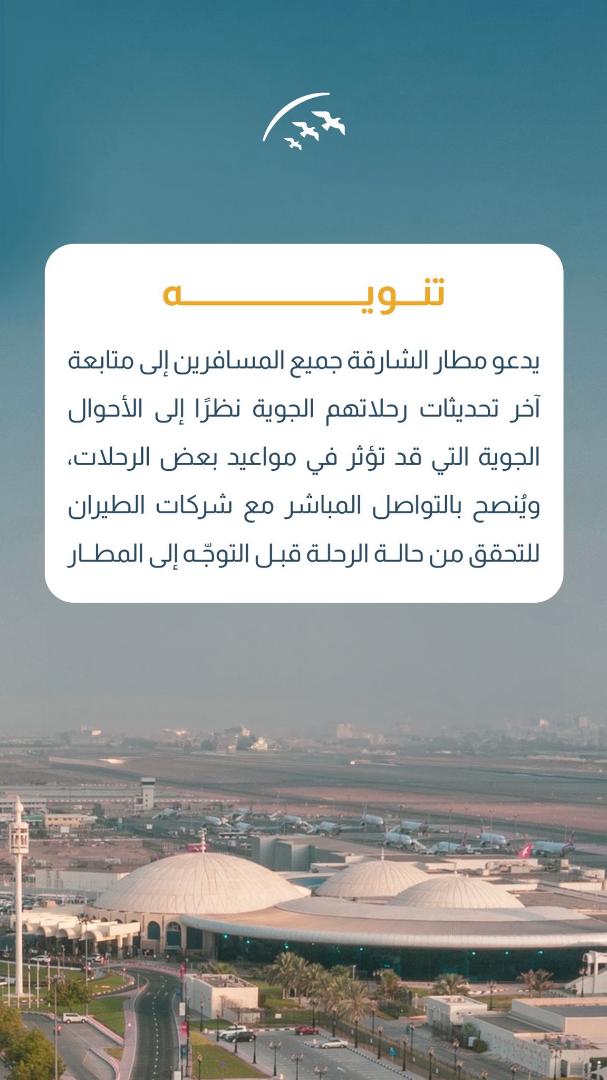 مطار الشارقة يدعو جميع المسافرين إلى متابعة آخر تحديثات رحلاتهم الجوية نظرًا إلى الأحوال الجوية التي قد تؤثر في مواعيد بعض الرحلات، ويُنصح بالتواصل المباشر مع شركات الطيران لتحقق من حالة الرحلة قبل التوجّه إلى المطار.