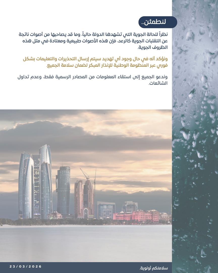 "الطوارئ والأزمات": لنطمئن .. نظراً للحالة الجوية التي تشهدها الدولة حاليًا، وما قد يصاحبها من أصوات ناتجة عن التقلبات الجوية كالرعد، فإن هذه الأصوات طبيعية ومعتادة في مثل هذه الظروف الجوية، ونؤكد أنه في حال وجود أي تهديد سيتم إرسال التحذيرات والتعليمات بشكل فوري عبر المنظومة الوطنية للإنذار المبكر لضمان سلامة الجميع، وندعو الجميع إلى استقاء المعلومات من المصادر الرسمية فقط، وعدم تداول الشائعات.