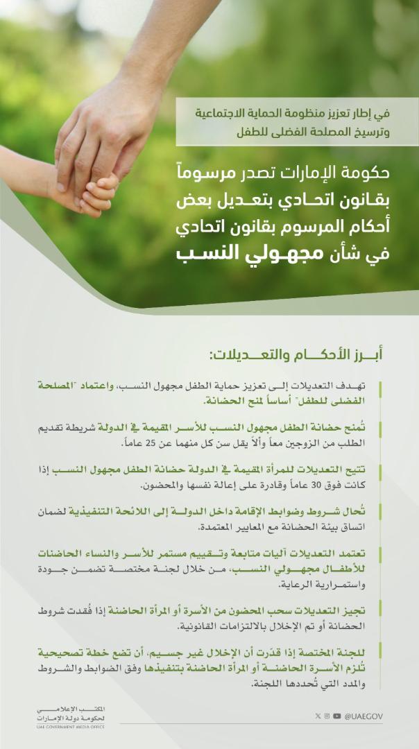 حكومة الإمارات تصدر مرسوماً بقانون اتحادي بتعديل بعض أحكام المرسوم بقانون اتحادي في شأن مجهولي النسب في إطار تعزيز منظومة الحماية الاجتماعية وترسيخ المصلحة الفضلى للطفل، وجاء من أبرز الأحكام والتعديلات: