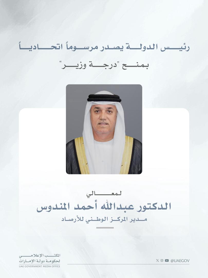 رئيس الدولة يصدر مرسوماً اتحادياً بمنح معالي عبدالله أحمد المندوس مدير المركز الوطني للأرصاد "درجة وزير"