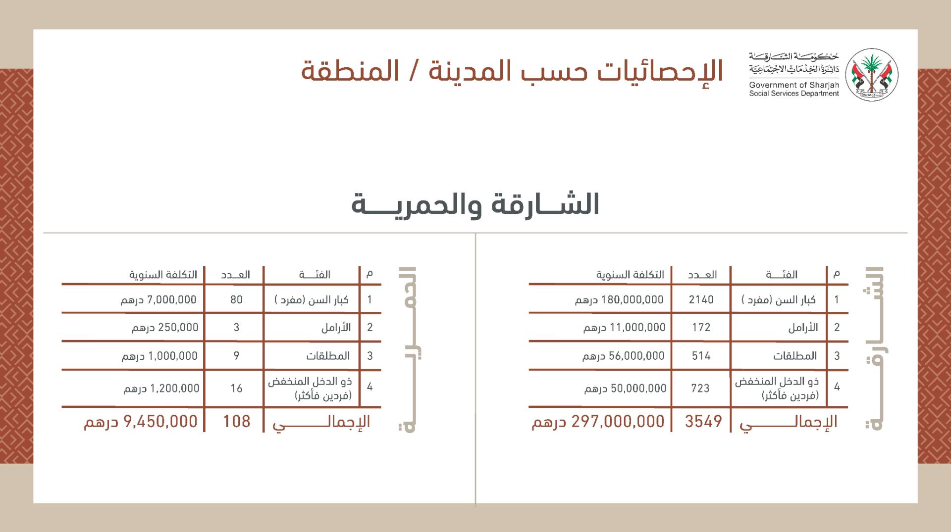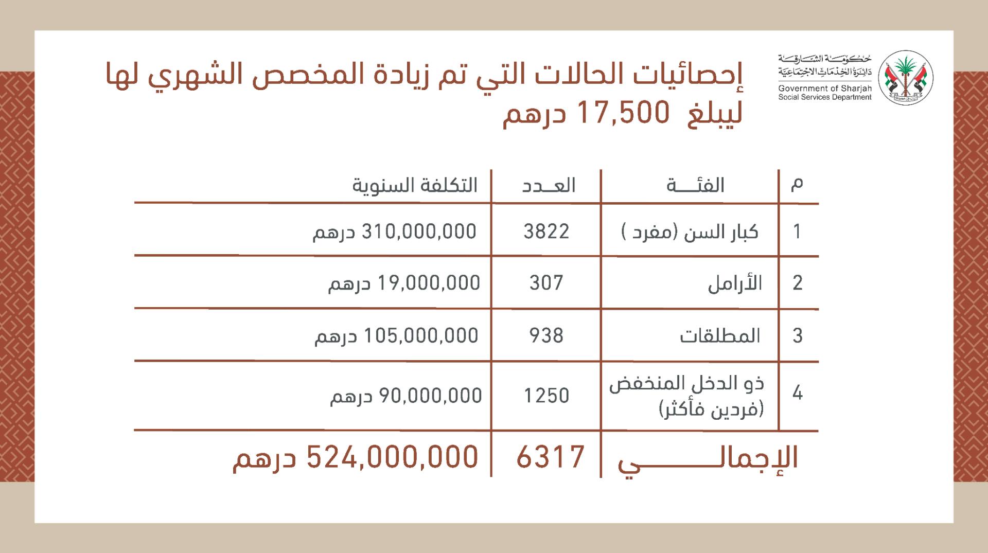 تنفيذاً لتوجيهات حاكم الشارقة .. مريم ماجد الشامسي، رئيسة دائرة الخدمات الاجتماعية في الشارقة، تعلن عبر "الخط المباشر"، رفع المخصصات الشهرية لـ6317 مواطناً ومواطنة في إمارة الشارقة، إلى 17,500 درهم شهرياً، ضمن فئات "كبار السن - الأرامل- المطلقات - ذوي الدخل المنخفض (فردين فأكثر)"، بقيمة إجمالية سنوية قدرها 524 مليون درهم، على أن يتسلموا المخصصات الجديدة اعتباراً من شهر يناير 2026.